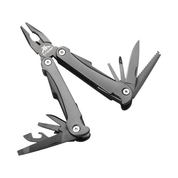 Stainless Steel components in black finish 13 multi tool functions: long nose pliers, standard pliers, wire cutter, files, slotted screwdrivers, Phillips screwdriver, saw, bottle openers, knife Nylon pouch (55mm W x 22mm H x 120mm D) Supplied in a Trekk gift box with magnetic closure (160mm W x 145mm H x 40mm D)